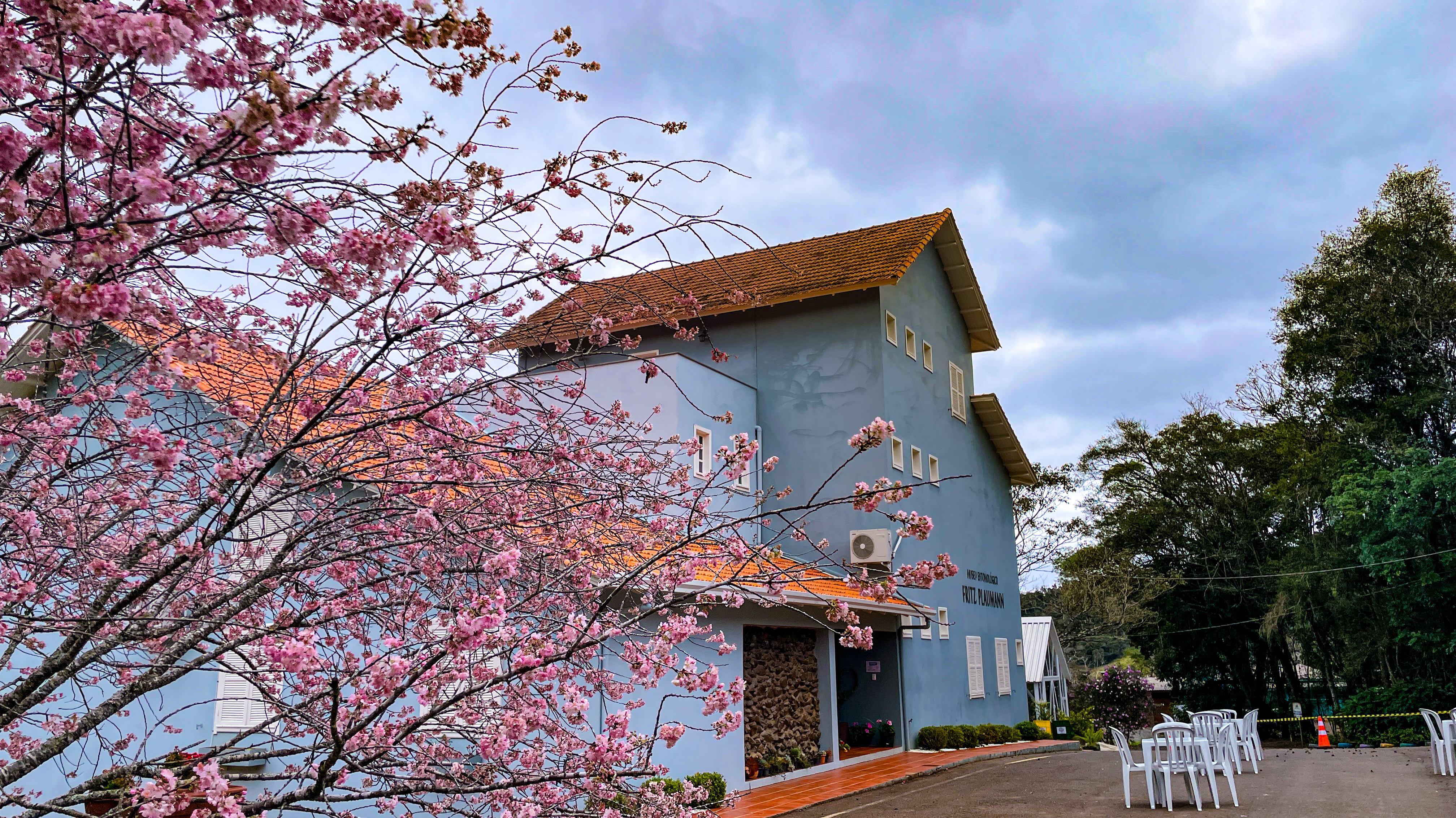 Florada das cerejeiras transforma o entorno do Museu Fritz Plaumann, em Seara