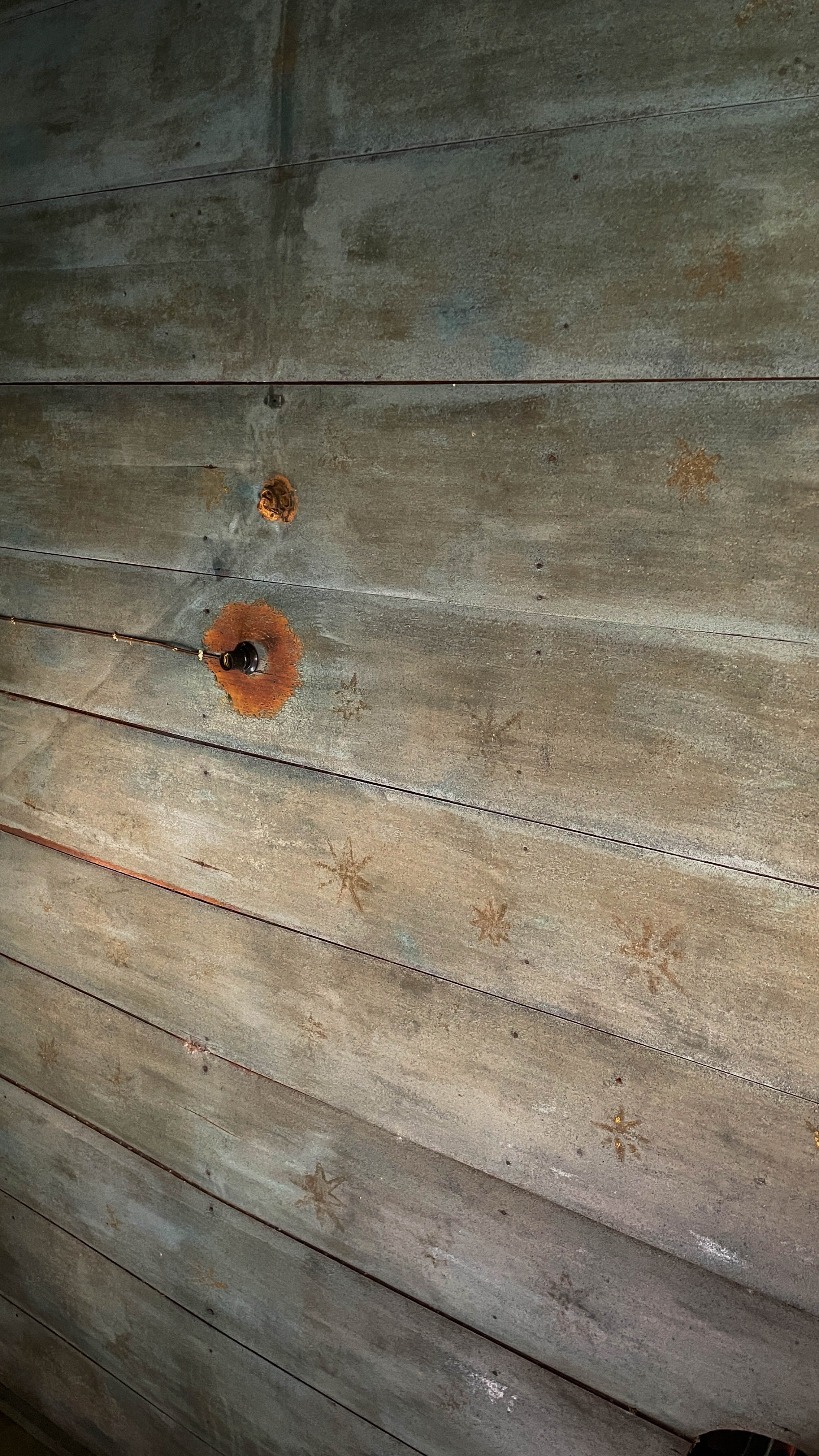 Outro detalhe que chamou a minha atenção foi o fato de haver desenhos em algumas partes do teto e também nas portas dos quartos. Hoje, com as cores mais singelas em decorrência do passar dos anos, as pinturas ainda resistem e mostram o capricho em cada detalhe da antiga casa.