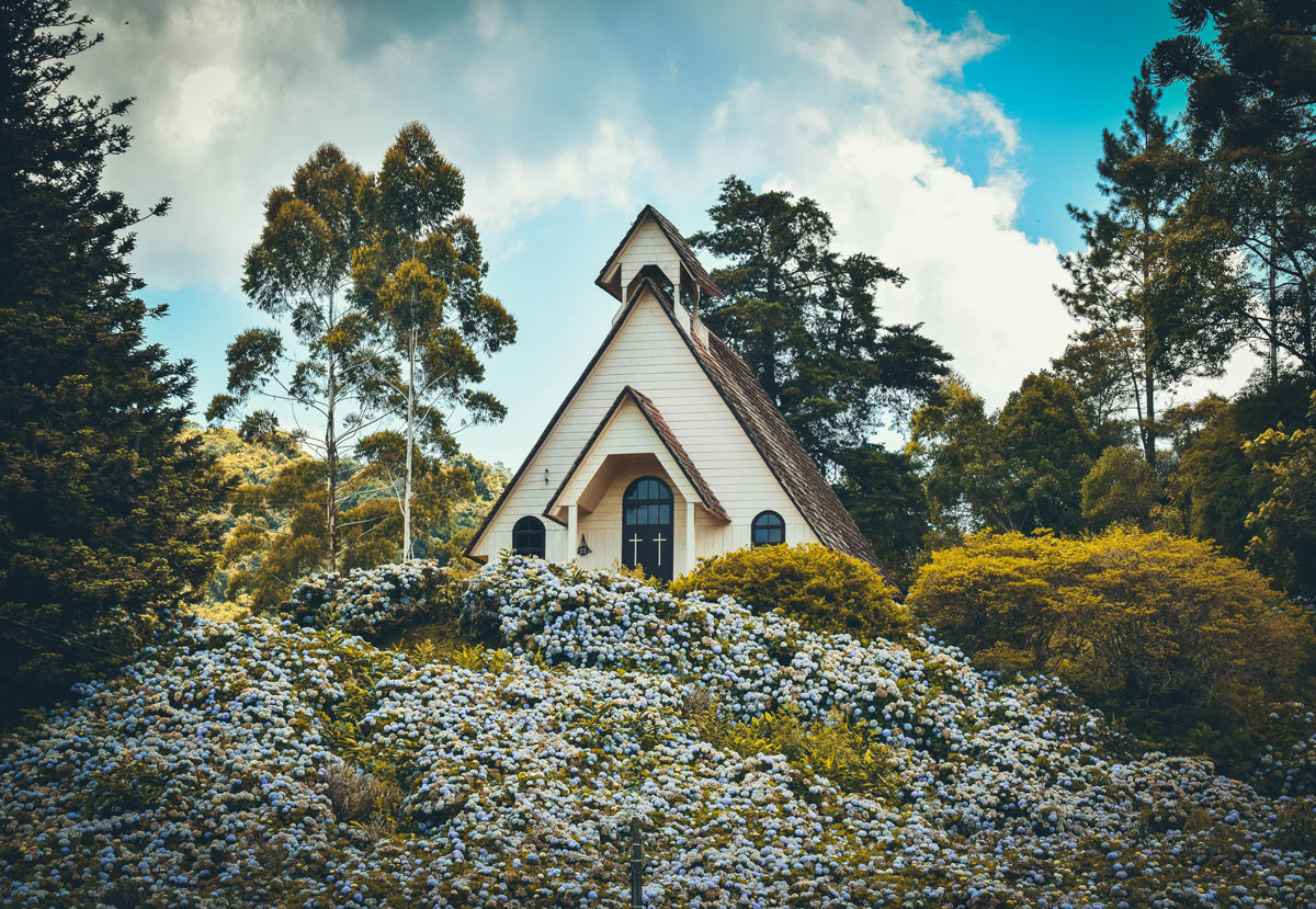 Para acessar a capela, o trajeto deve ser feito a pé em meio às hortensias. Foto: Jessica Edel