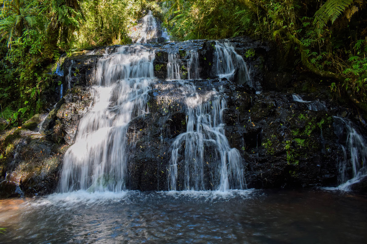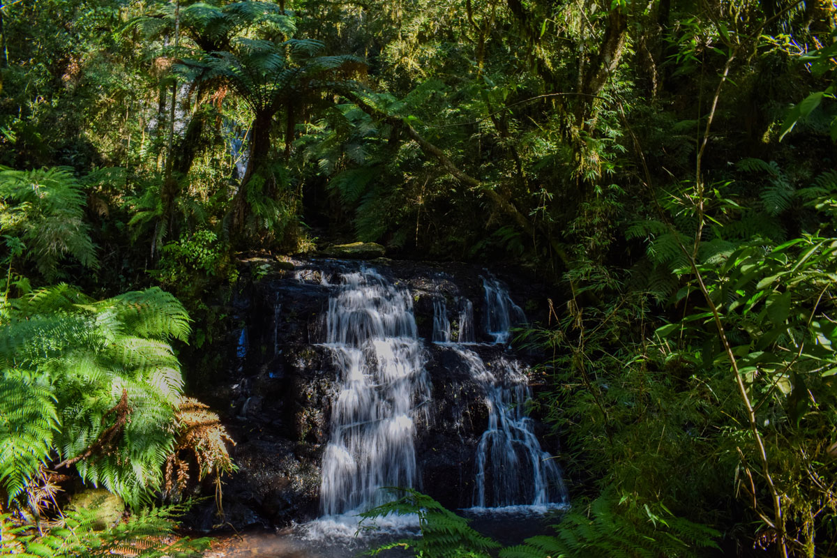 O caminho para chegar até as cachoeiras foi marcado por um ambiente selvagem, pegadas, bochas de pinhão espalhadas pelo chão e inúmeros indícios de que a vida selvagem é ativa na região.