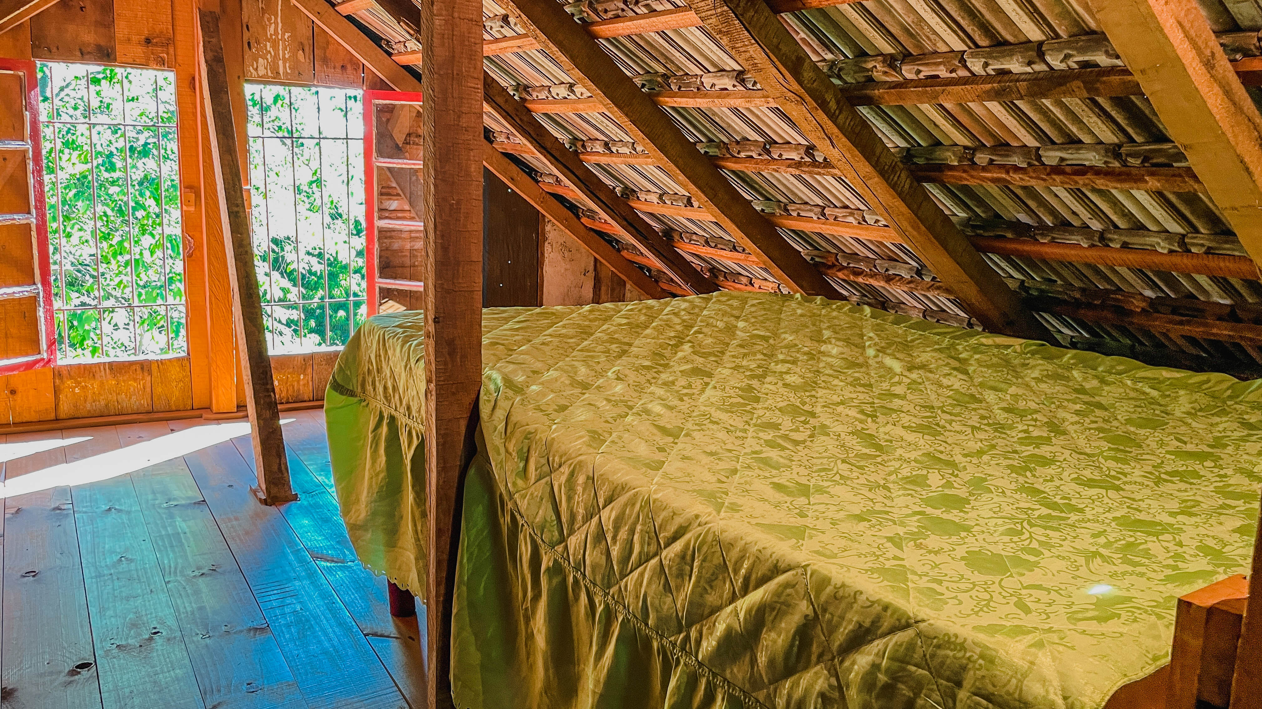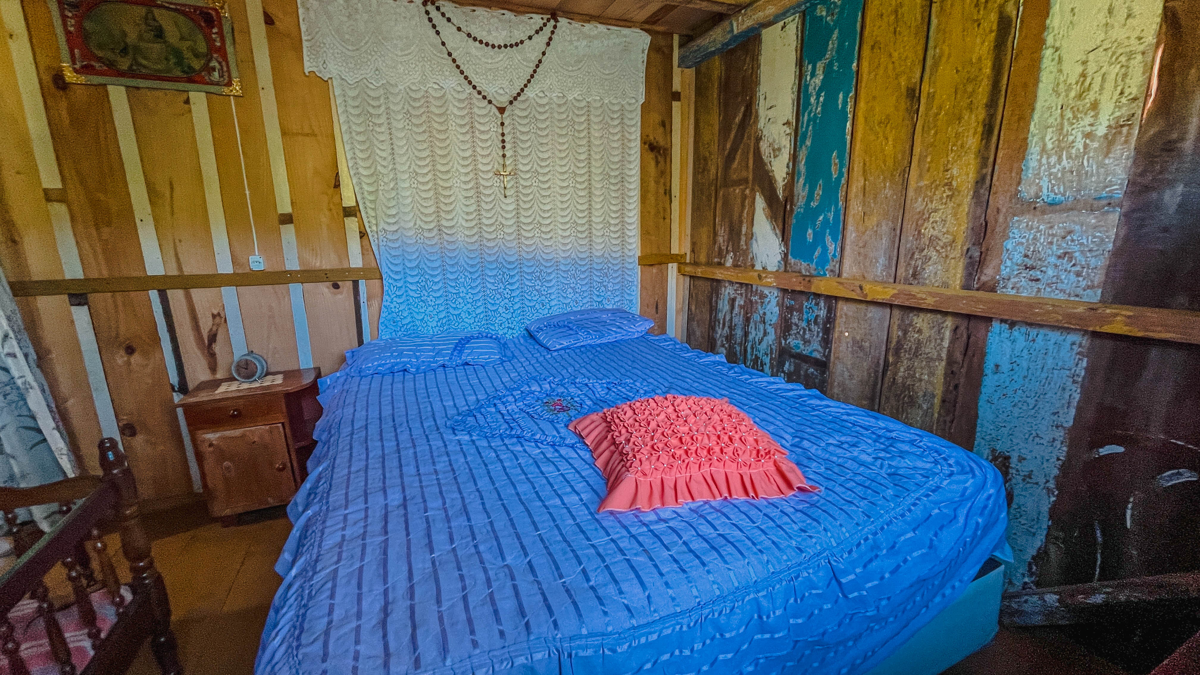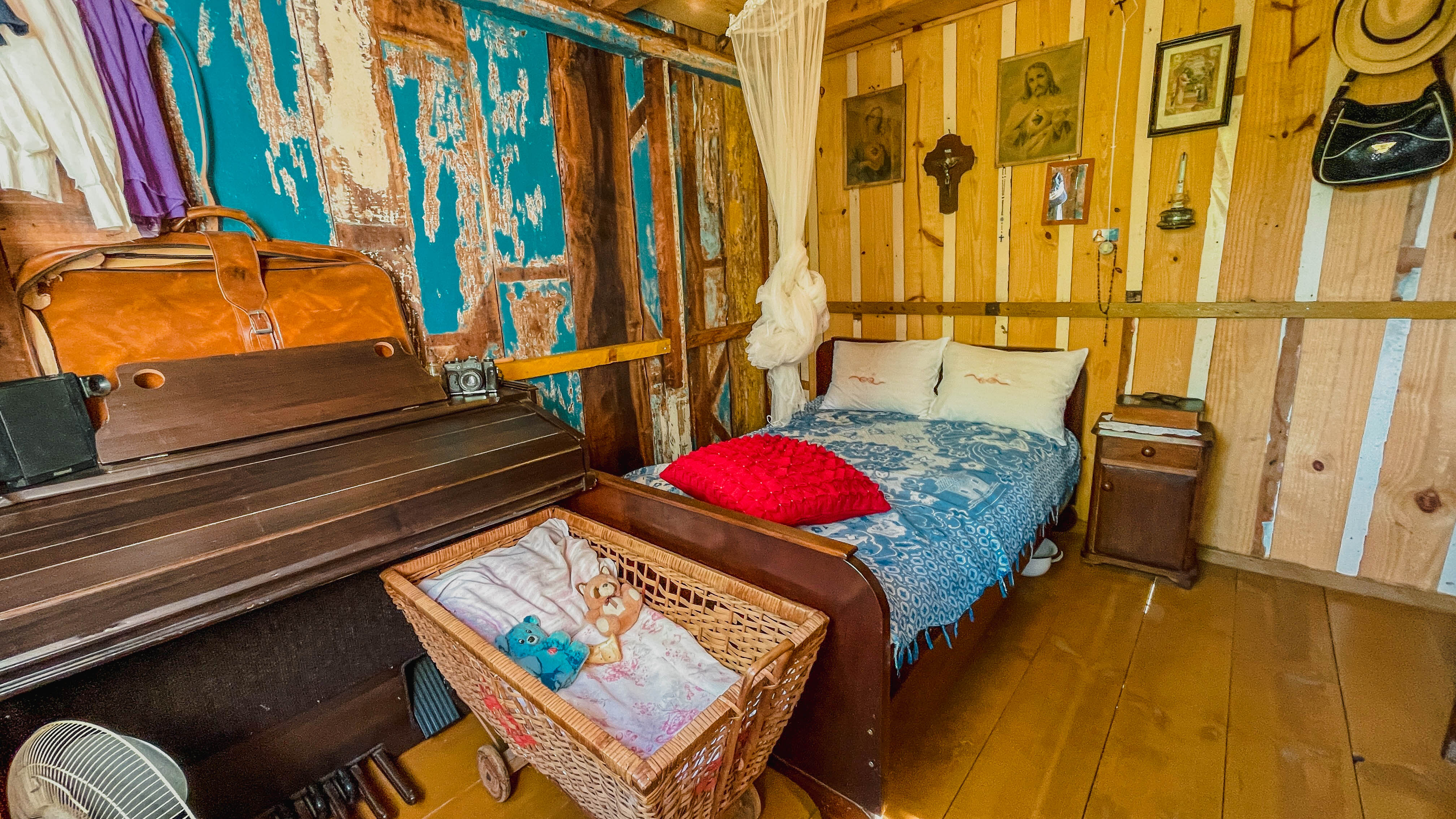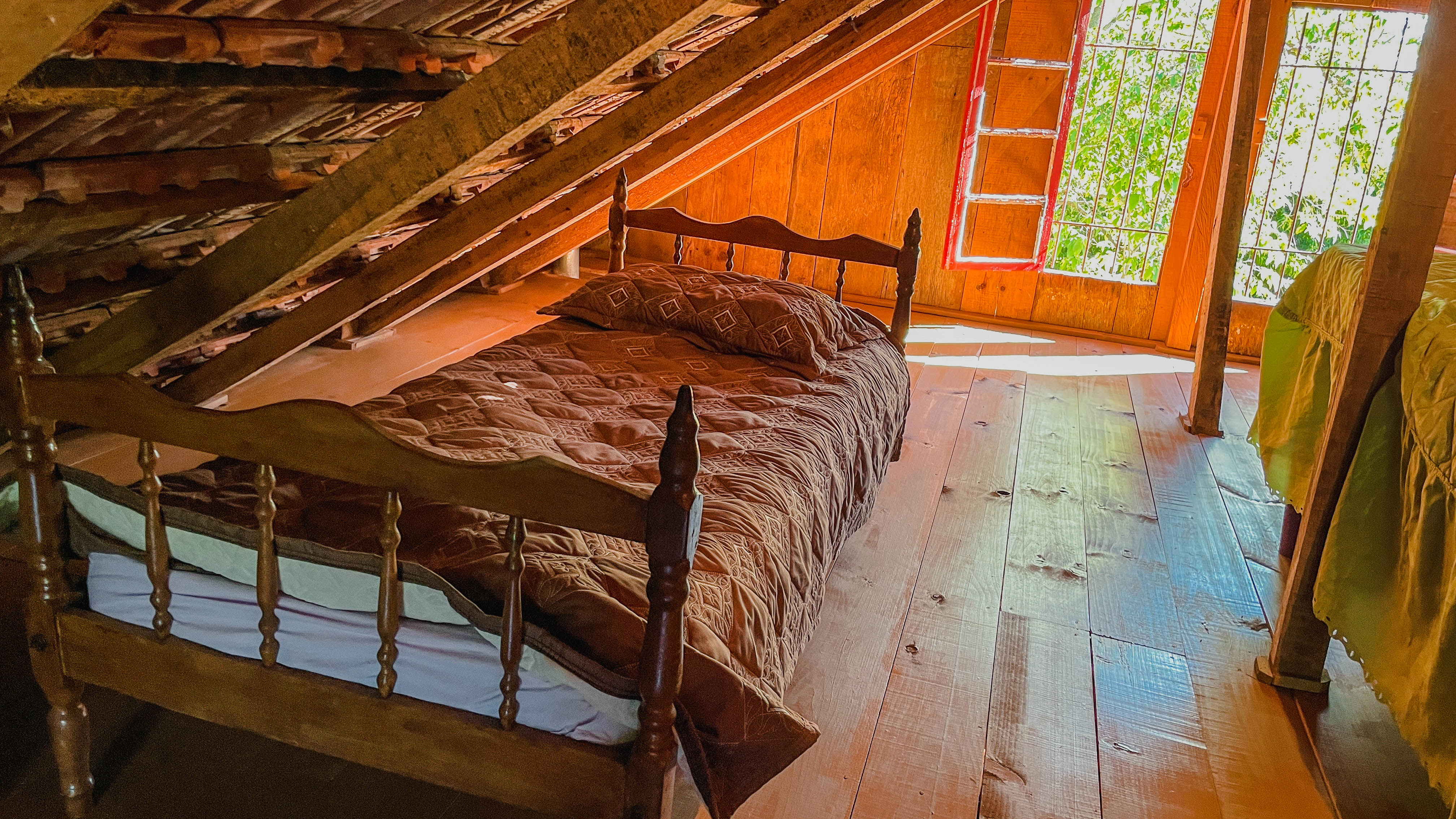 É importante também destacar que, em um dos quartos tem cama com colchão de palha e travesseiros feitos com penas, itens comumente utilizados no passado.