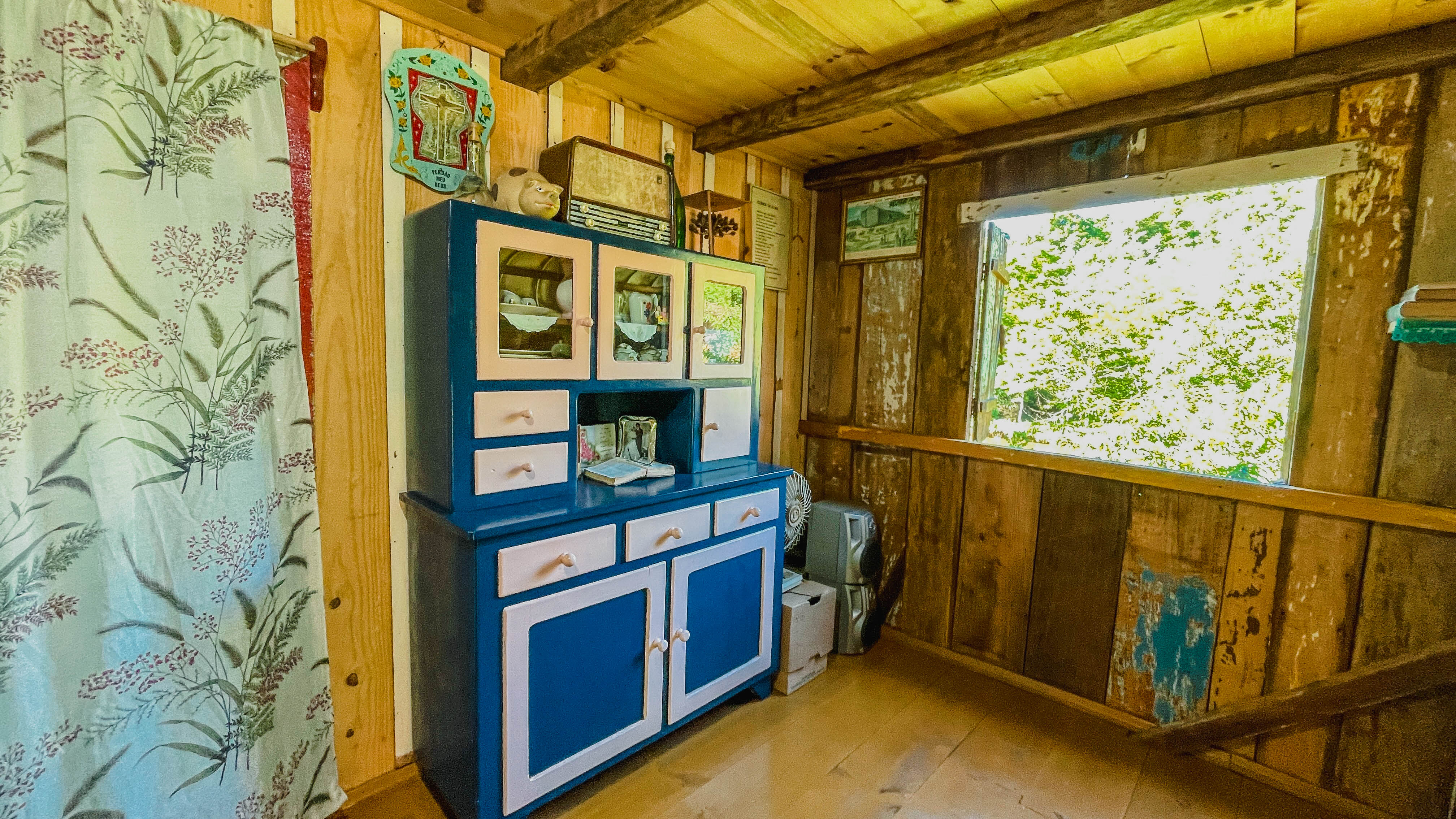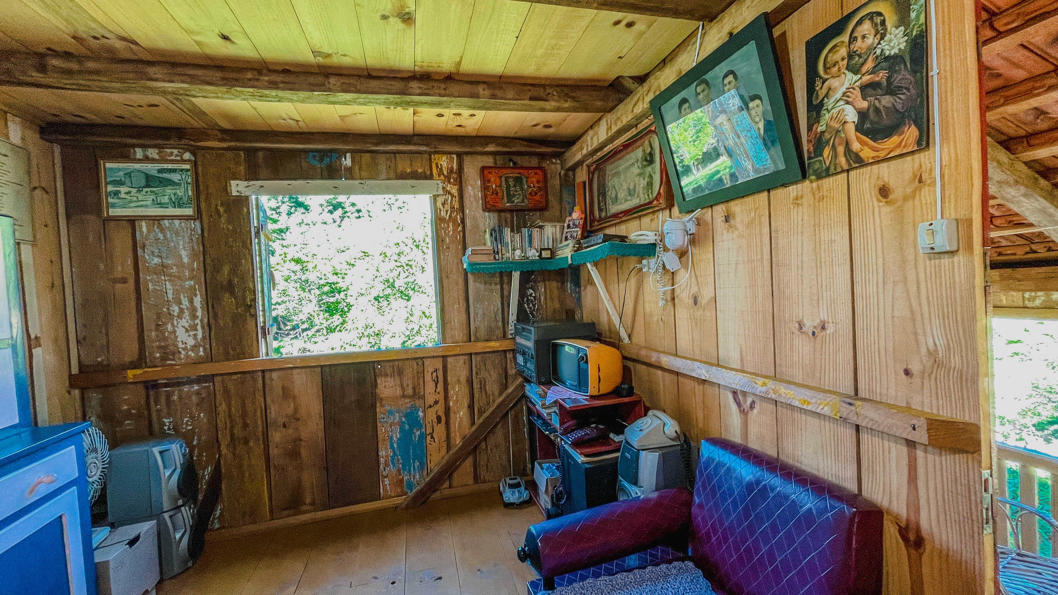 A casa, que é feita de madeira, também têm pedras em sua construção. No porão, foram adicionadas pedras da própria propriedade. A residência abriga área externa, sala, cozinha e dois quartos no primeiro andar. Também têm o sótão, onde há camas e colchões para grupos maiores.