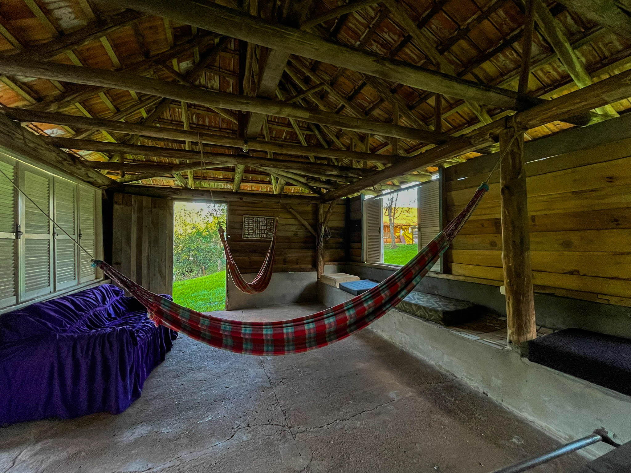 Que tal relaxar após fazer uma trilha ou tomar um banho de cachoeira? No sítio há um espaço com redes, sofá e bancos para você relaxar a repor as energias.
