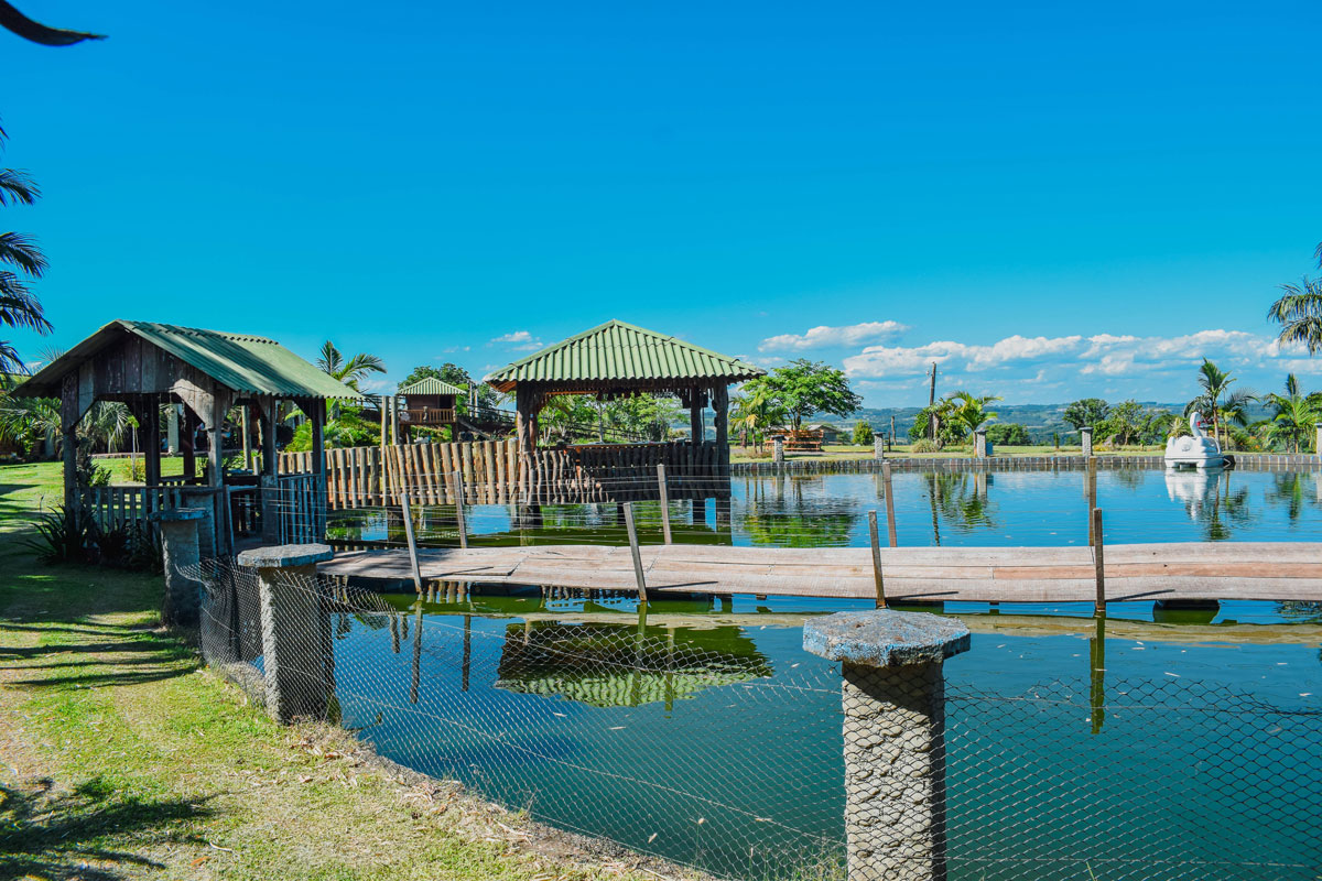 Um lago, onde você pode dar alimento (fornecido gratuitamente na propriedade) aos peixes;